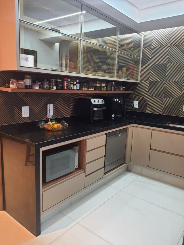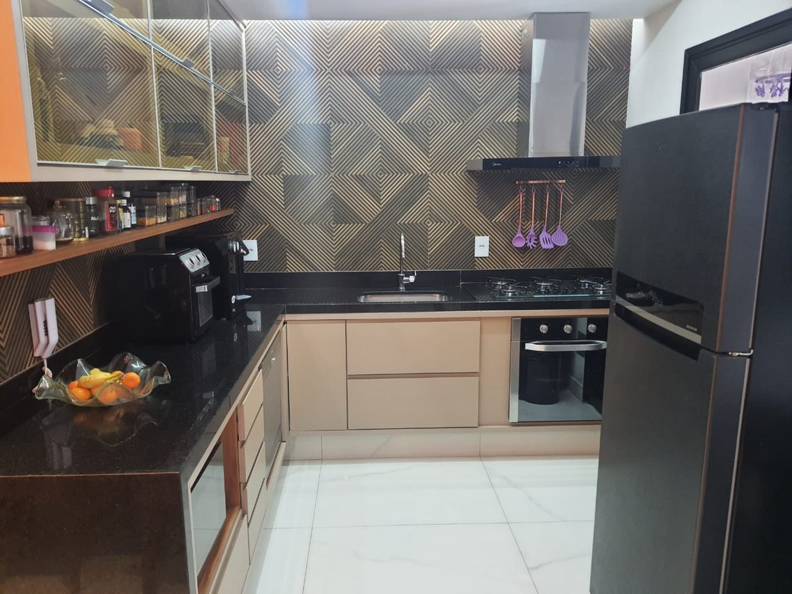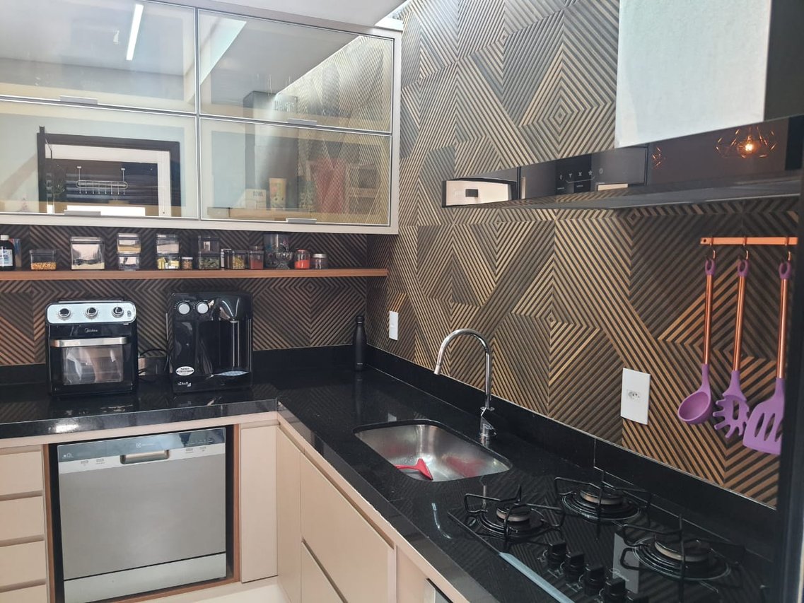 Cozinha planejada completa com coifa, fogão por indução, forno e lava-louças